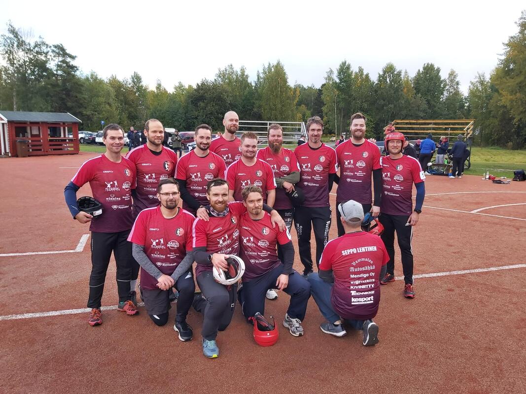 Päivä käynnistyi todella tasaisella välieräottelulla TPT:n ja Mouhijärven Urheilijoiden välillä. Runkosarjan voittanut TPT oli pelissä pitkään ahdingossa ja venyi tasapeliin 8-8. Ratkaisu voittajan saamiseksi piti kuitenkin löytää ja sitä haettiin kotiutuskisan kautta. Kotiutuskisat toisensa jälkeen päättyivät tasan. Voittajan löytäminen kesti lähes kaksi tuntia ja lopulta TPT eteni finaaliin tuloksella 15-14. Toisessa välierässä kohtasivat runkosarjan kakkonen KiiMa Kiikoisista ja Nurmeksen Sep-pot. Tämäkin peli oli hyvätasoinen ja tasaväkinen. KiiMa nappasi voiton juoksuin 6-2 ja samalla paikan loppuotteluun. Pronssiottelussa kävi nopeasti esille, että Mouhijärven eväät oli syöty jo päivän avauspelissä sekä odottelun aikana. Sep-pot voitti pronssiottelun juoksuin 15-3. Finaali eteni alusta asti hyvin tasaiseen tahtiin. Ensi johti KiiMa, sitten TPT, KiiMa tasoitti ja viimeiseen tasoittavaan vuoroon lähdettiinkin lukemista 3-3. Tyrvääläiset tekivät väkisin juoksun ja TPT:n voittojuhlat olivat valmiina. |