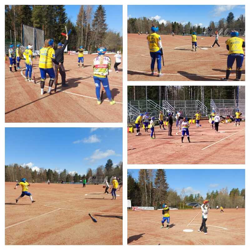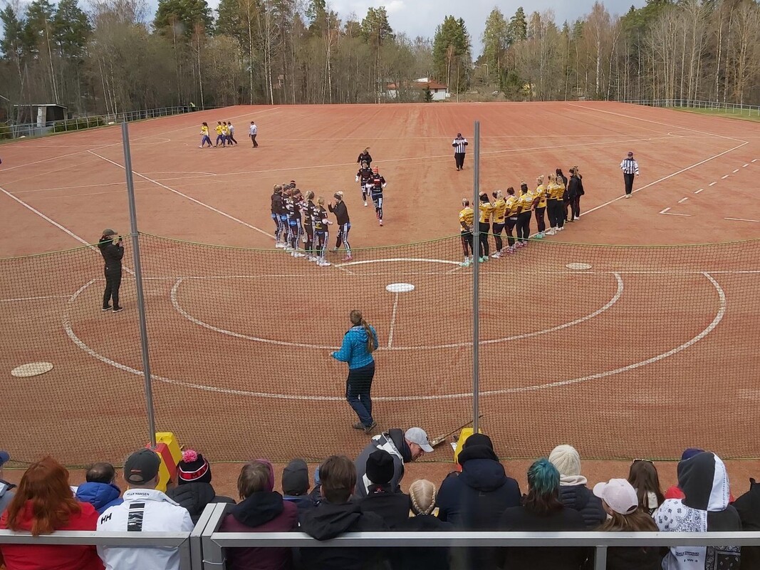 Päivän ”lämmittelypelissä” Kumurin maakuntasarjan naiset pelasivat hienoa ulkopeliä ja ylsivät yllätysvoittoon. Pelikumppani Loimaan Palloilijat tiedettiin nopeaksi ja taitavaksi joukkueeksi, mutta Supervappu innoitti kotijoukkueen oivaan esitykseen. Jännä peli päättyi kotijoukkueen voittoon jaksovoitoin 2-0 (4-3, 6-3). Harjoituspelin lopuksi kokeeksi pelattu kotiutuskisakin päätyi Kumurin nimiin 3-1. Kumurin voiton takeena oli tällä kertaa pitävä ulkopeli. Ja toisen jakson ratkaisi viimeisen tasoittavalla vuorolla Julia Ruisniemen mahtava tälli kakkospesän taakse tuottaen koko kentän tyhjennyksen. |
