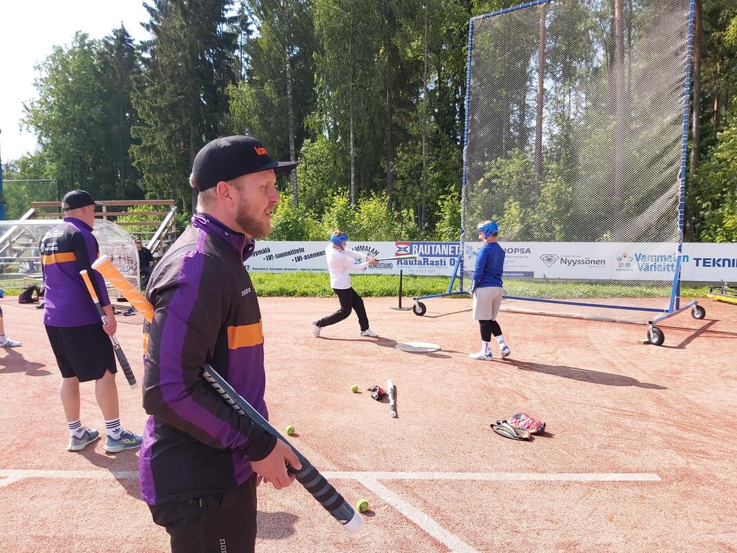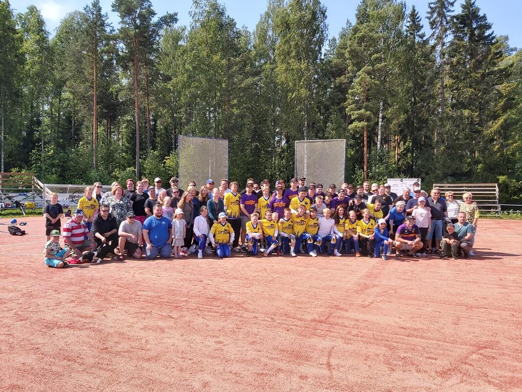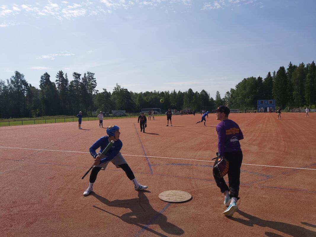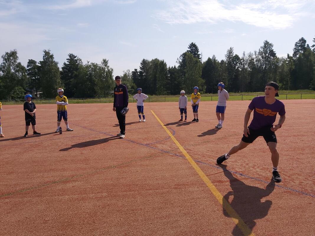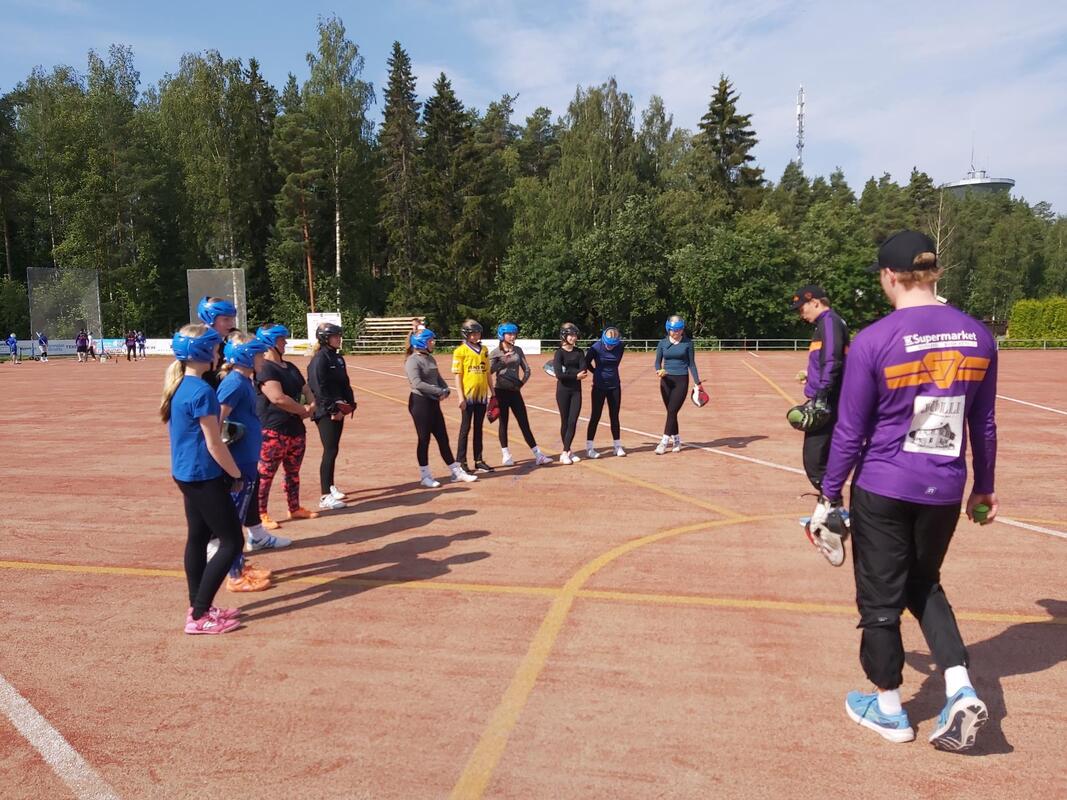Pesis on kivaa ja vielä kivempaa se on maailman parhaiden kanssa. Kun Sotkamon Jymyn bussi kaarsi aamulla Varilan kentällä, odotti 26 jo valmiiksi lämmitellyttä Kumurin junioria jännittyneinä mitä tapahtuu. Pelinjohtaja Iiro Haimi kutsui osallistujat kotipesän kaarelle. Tehtävänjako Jymyn miehille ja ryhmäjako Kumurin väelle suoritettiin ripeäasti ja tämän jälkeen alkoi tapahtua. Lukkari Miika Keski-Petäjä, viime kauden Kultaisen Räpylän saanut Hannes Pekkinen sekä ensi viikonloppuna miesten Itä-Lännessä pelaava Elmeri Purmonen ottivat yhden ryhmän haltuun ja aiheena oli hyvät lähdöt ykköspesältä. Toisaalta Kalle Kuosmanen ohjasi lyömään sellaisen näpin, ettei Pekkinen siitä Kumurin etenijää polttaisi. Toisaalla kaikkien aikojen menestynein pesäpalloilija Roope Korhonen yhdessä Tommi Piiraisen ja Aleksanteri Huotarin kanssa jakoivat vinkkejä lyönteihin. Roope korosti lyönnin vauhdin suuntaa ja vartalon käyttöä lyönnin voiman lisäämiseen. Tästä useampikin juniori nappasi kopin. Ja kolmannessa ryhmässä heitettiin palloa. Ehkä kukaan ei ihan yltänyt viime vuoden pesäpalloilija Iivari Vihannon heittokäteen, mutta tipsejä sieltäkin sai. Vaikka jokin heittodrilli olisikin ollut entuudestaan tuttu, Jymyn miesten vetämän se sai aivan uuden tatsin. Ja sitten pelattiin. Kaksi joukkuetta oli nimetty Jymyn legendojen mukaan Unskit (Unto Väisänen) ja Karrat (Kari Hakkarainen). Molemmissa joukkueissa pelasi kuusi Jymyn miestä ja kuusi Kumurin junioria. Pelissä nähtiin hienoja Kumurin pelaajien venymisiä, sillä eihän sitä voinut Jymyn miesten kanssa huonosti pelata. Unskien koppari Peetu Tuomisto ihastutti kiinniotoillaan. Peetu joutui Roope Korhosen pommituksen kohteeksi, mutta pallo toisensa jälkeen löytyi Peetun räpylästä. Myös sieppari Hertta Tirkkonen oli iskussa poimien koppeja kuin marjoja. Molemmat Kumurin juniorit palkittiin joukkueidensa parhaina. Karrat joukkueessa loisti keskikentällä Luukas Laaninen. Ehtipä hän pelaamaan vuoron lukkarinakin ja ohjaamaan myös pelinjohtaja Petteri Timosen merkkipeliä. Kolmospolttaja Olivia Ojala napsi palloja todella mallikkaasti ja eteni kärkipelaajana vuorenvarmasti. Jymyn pelaajista kunnarin iskivät kolmosrajasta lukkari Miika Keski-Petäjä ja viime vuoden poikapelaaja Samuel Huotari. Niin ja peli päättyi tasan 9-9. Toiminnallinen päivä Sotkamon Jymyn miesjoukkueen päivä oli todella mahtava ja onnistunut. Kentältä poistui tyytyväisiä Jymyn miehiä ja innostuksesta iloisia junioripelaajia. KIITOS SOTKAMON JYMY!